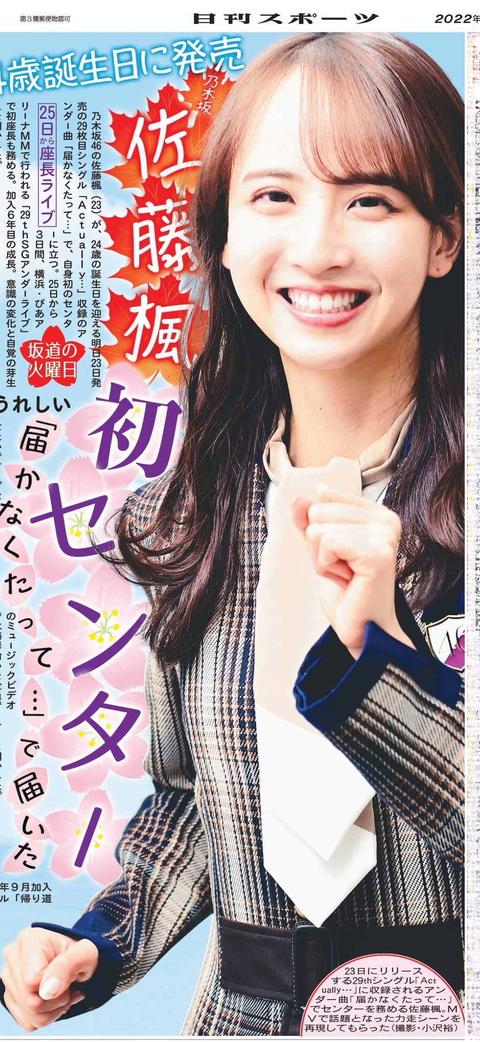 ◆佐藤楓(さとう・かえで)1998年(平10)3月23日、愛知県生まれ。16年9月加入の3期生。愛称「でんちゃん」。18年11月発売のシングル「帰り道は遠回りしたくなる」で初選抜入り。161センチ。血液型A。