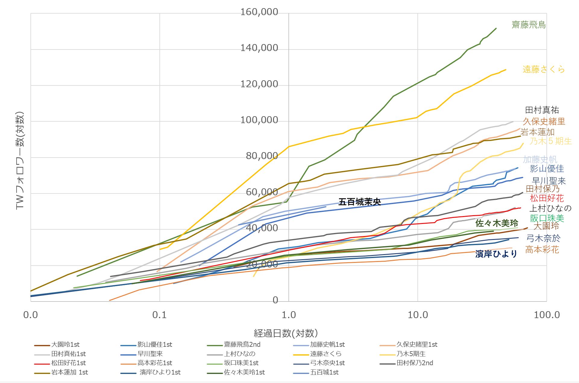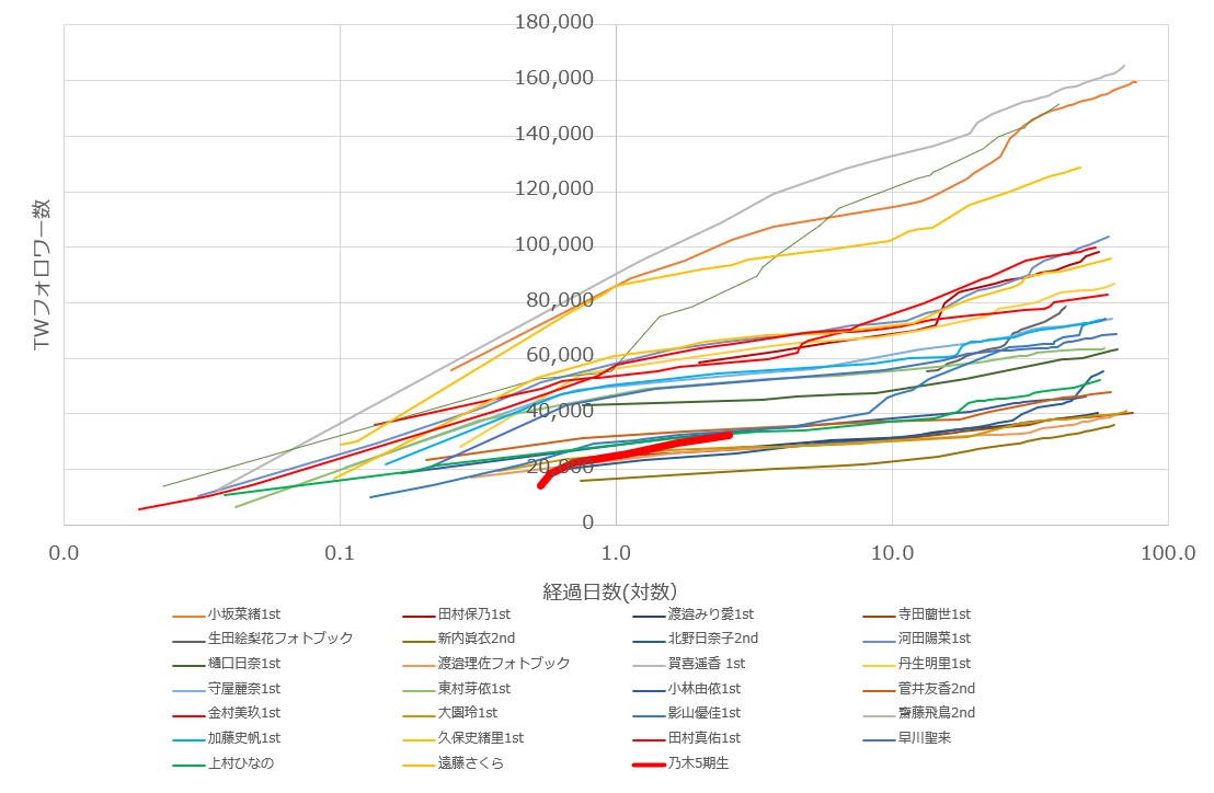 乃木坂5期生の写真集発売ということで、フォロワー数の増加推移をみていますが、いまのところ発売日に6万フォロワーぐらいのペースかな?